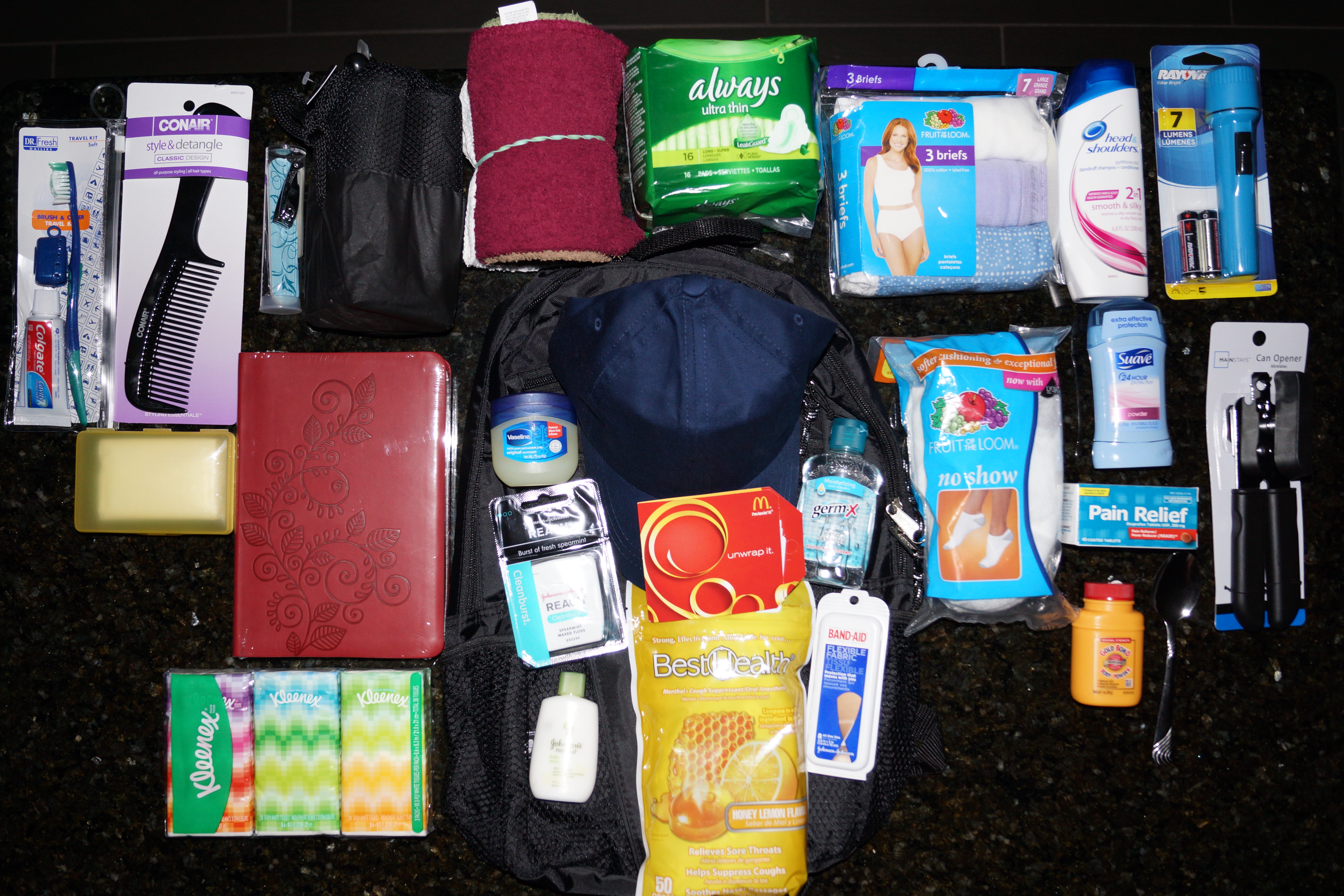 Toothpaste, toothbrush, comb, nail clippers, soap, Kleenex, poncho, wash cloths, Vaseline, dental floss, lotion, McDonald’s gift card, cough drops, cap, feminine napkins, hand sanitizer, Band-Aids, underwear, socks, foot powder, shampoo and conditioner, deodorant, aspirin, spoon, can opener, flashlight, Bible, and backpack.